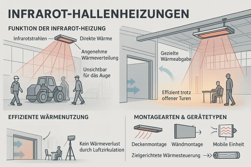 • Lösung: Infrarotheizungen erwärmen gezielt Arbeitsbereiche und vermeiden Energieverluste durch Luftzirkulation.